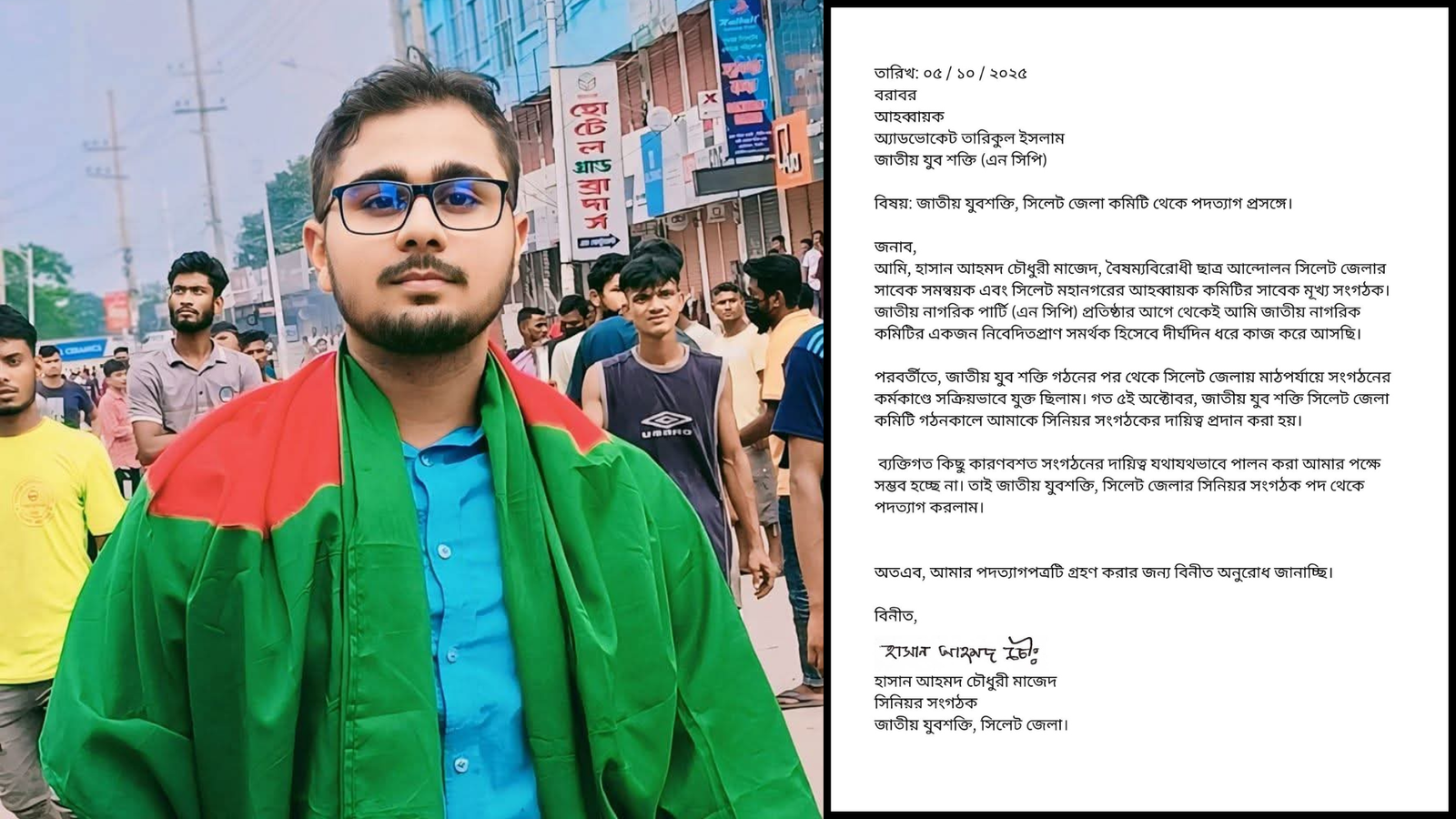 পদত্যাগপত্রে তিনি উল্লেখ করেন, বৈষম্যবিরোধী ছাত্র আন্দোলন সিলেট জেলার সাবেক সমন্বয়ক এবং পরবর্তী সময়ে সিলেট মহানগর আহ্বায়ক কমিটির সাবেক মুখ্য সংগঠক হিসেবে দীর্ঘদিন ধরে কাজ করেছেন তিনি। এছাড়া জাতীয় নাগরিক পার্টির সময় সূচনালগ্ন থেকেই তিনি সংগঠনের সাথে যুক্ত ছিলেন বলে উল্লেখ করেন।