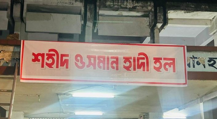 ঢাকা বিশ্ববিদ্যালয়ের (ঢাবি) একদল শিক্ষার্থী বঙ্গবন্ধু শেখ মুজিবুর রহমান হলের নাম পরিবর্তন করে ‘শহীদ ওসমান হাদী হল’ নামকরণ করেছেন। এ সময় হলের সামনে নতুন নাম সংবলিত একটি ব্যানারও টানানো হয়।