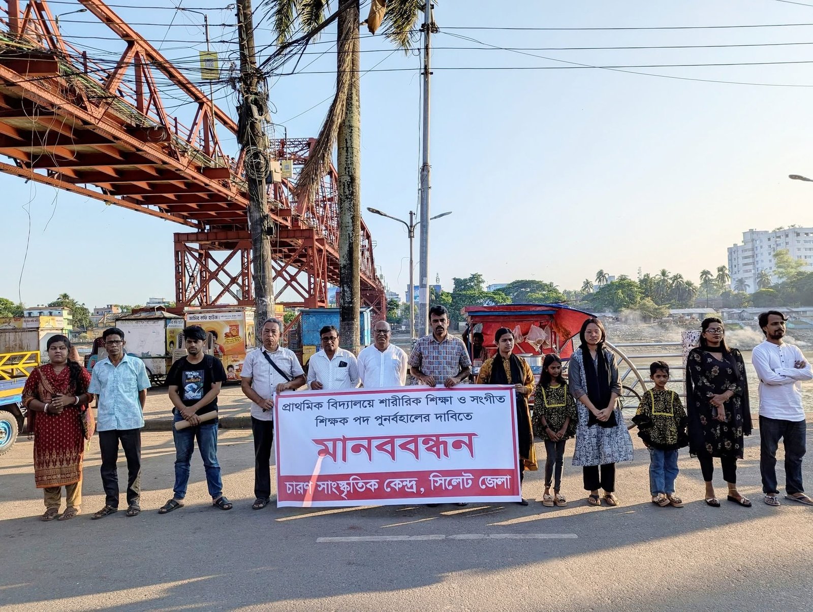 প্রাথমিক বিদ্যালয়ে শারীরিক শিক্ষা ও সংগীত শিক্ষক পদ পুনর্বহালের দাবিতে আজ বিকাল ৩টায় শারদা হলের সম্মুখে চারণ সাংস্কৃতিক কেন্দ্র সিলেট জেলার আয়োজনে মানববন্ধন অনুষ্ঠিত হয়।