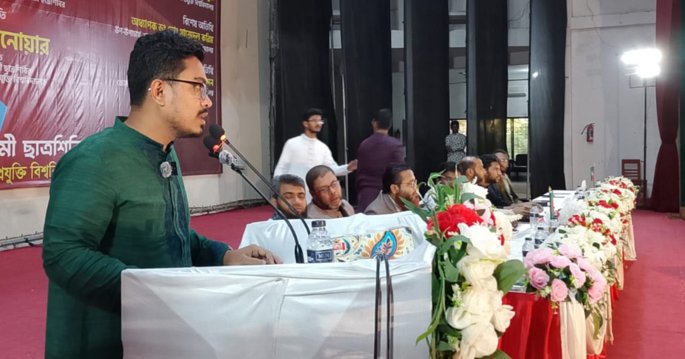 শাহজালাল বিজ্ঞান ও প্রযুক্তি বিশ্ববিদ্যালয়ের কেন্দ্রীয় মিলনায়তনে অনুষ্ঠিত ‘জুলাই স্মৃতি: শাবিপ্রবি’ গ্রন্থের মোড়ক উন্মোচন অনুষ্ঠানে বিতর্কিত বক্তব্য দিয়েছেন ঢাকা বিশ্ববিদ্যালয় কেন্দ্রীয় ছাত্র সংসদের ভিপি ও বাংলাদেশ ইসলামী ছাত্রশিবিরের কেন্দ্রীয় প্রকাশনা সম্পাদক সাদিক কায়েম।
